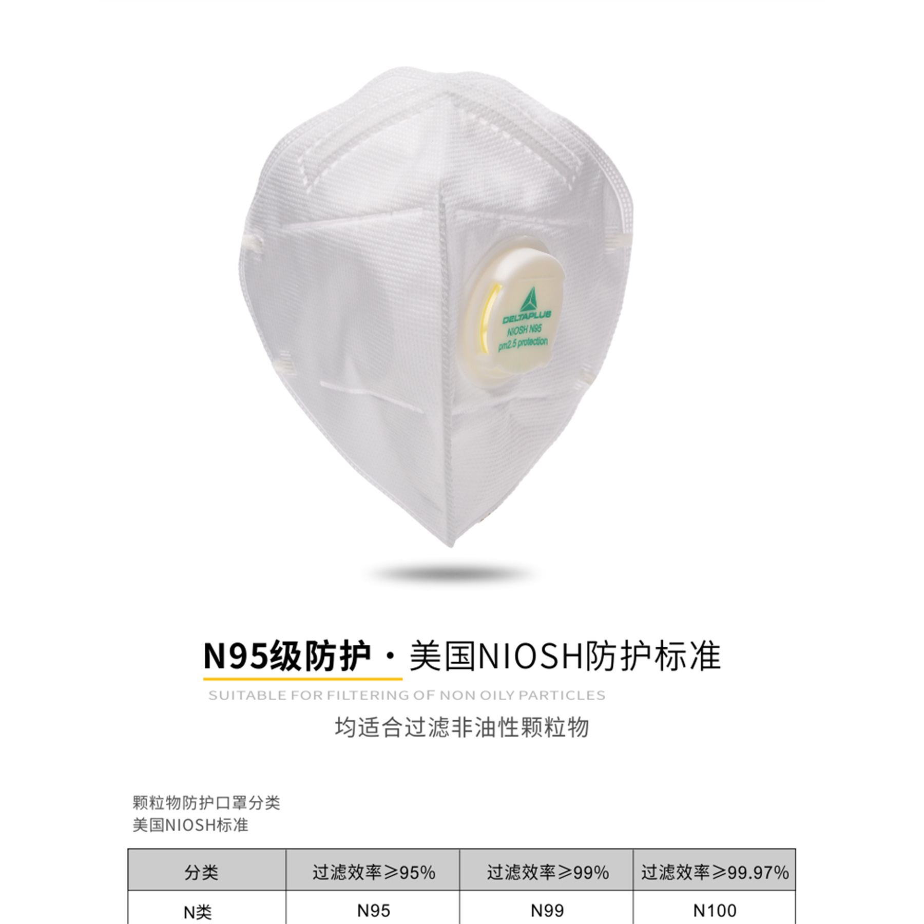 中国KN95级别和欧洲FFP2级别双重认证,对非油性颗粒物的过滤效率不低于95%